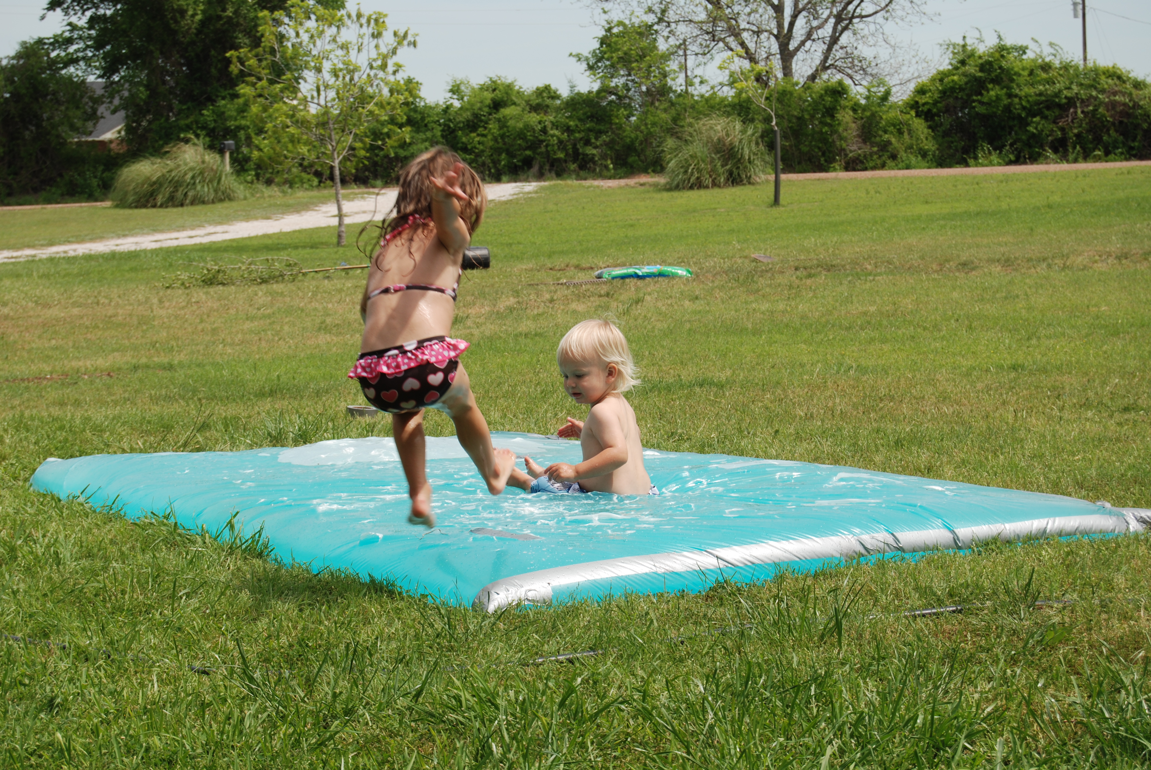 On Saturday, we made this water pillow. Seen on pinterest via The Mommies Made Me Do It. It did not last very long, I think mainly because the only thing Reese did was jump stomp it… but it was enough fun to be worth the 15 to 20 minutes and few dollars it took to put it together.